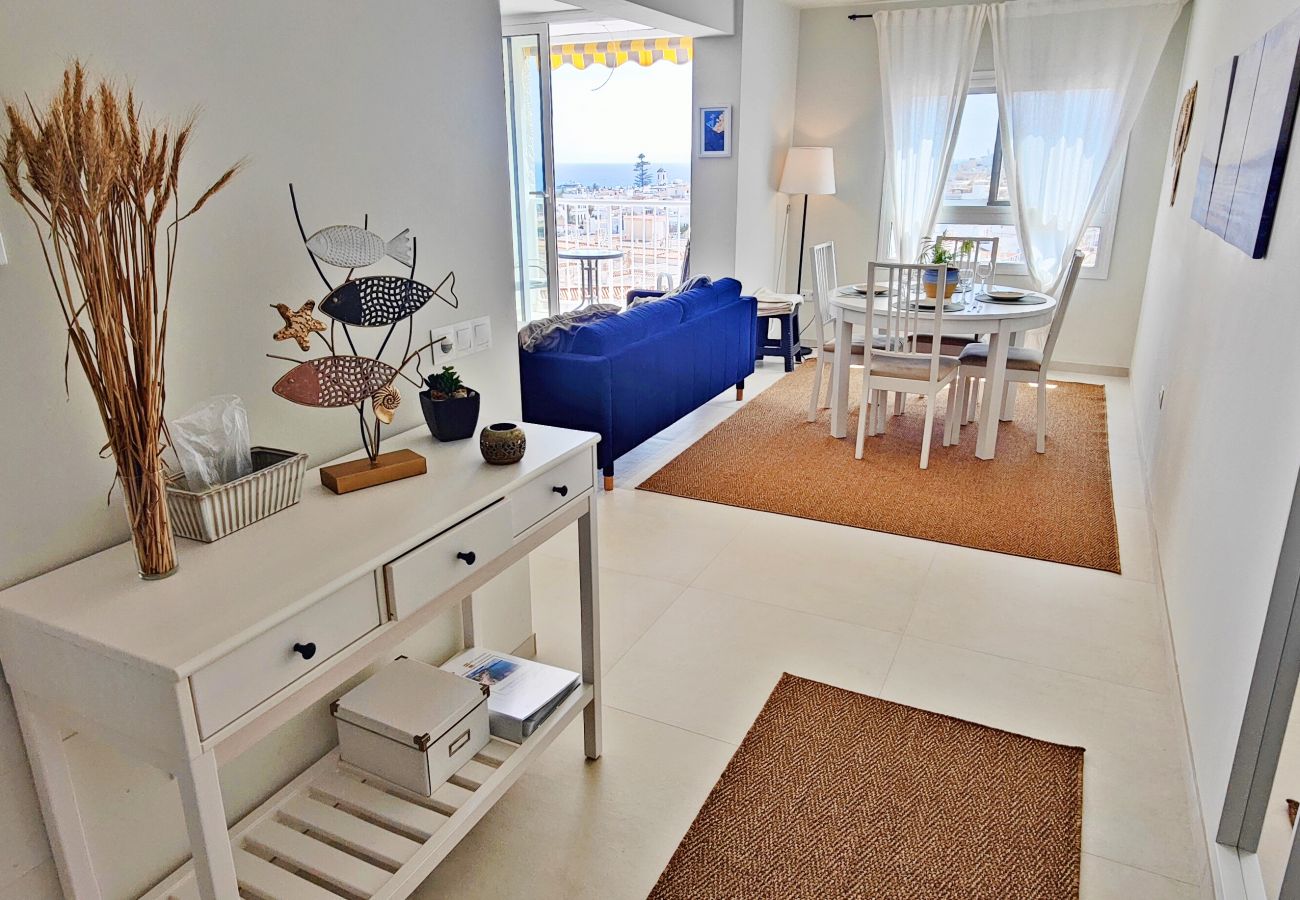 Un apartamento con fantásticas vistas sobre la ciudad y el océano. El apartamento está situado en el 6 º piso y con orientación oeste. El apartamento tiene 2 dormitorios, uno doble y otro doble y tiene capacidad para 4 personas. La sala de estar y el comedor son muy amplios y aireados. La cocina es abierta con una barra de bar frente a la sala de estar. Hay aire acondicionado en los dos dormitorios y en la sala de estar. El balcón tiene una mesa y 2 sillas. Hay piscina comunitaria y zona ajardinada.