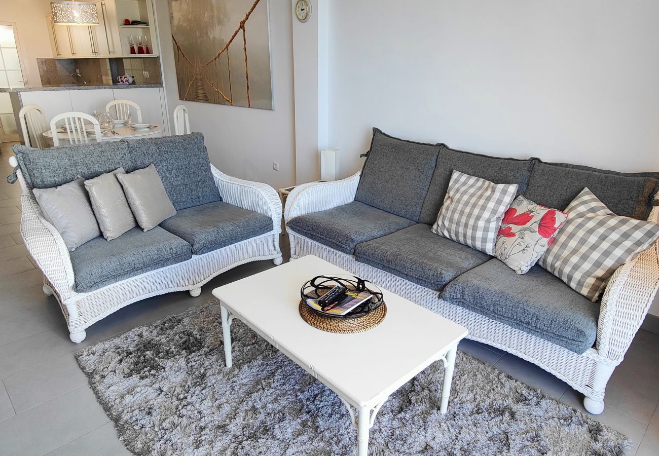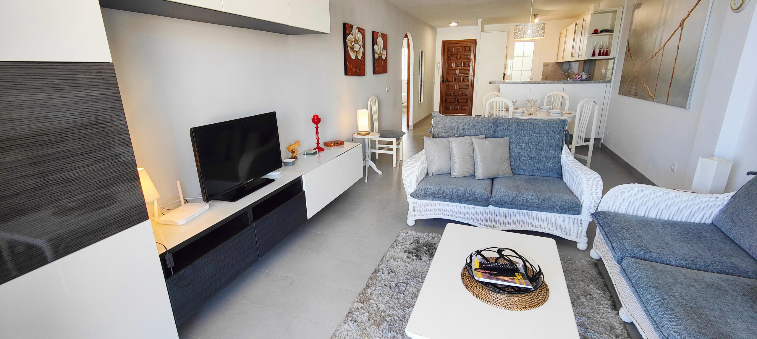 A la entrada encontramos un recibidor que nos lleva a la sala de estar con una cocina abierta moderna y totalmente equipada con vitrocerámica, horno, microondas, frigorífico y lavavajillas (la lavadora está en el baño). El salón está decorado y amueblado en un estilo moderno y confortable, con un sofá cama para dos personas, televisión satélite y zona de comedor con una mesa grande y sillas, desde esta zona se accede a la terraza.