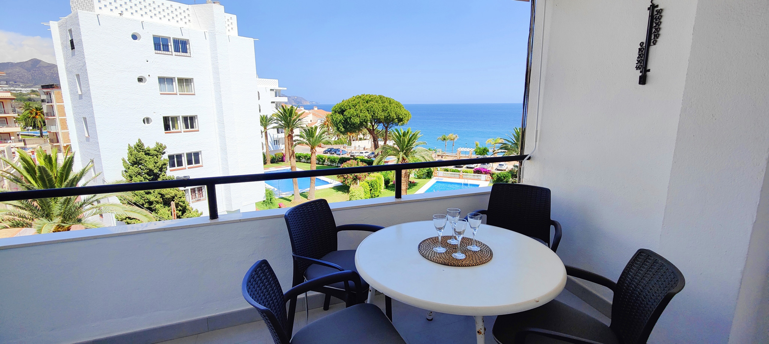Precioso y espacioso apartamento de dos dormitorios cerca del Parador de Nerja ya pocos pasos de la playa Carabeillo y el Balcón de Europa. Hay una piscina comunitaria.
