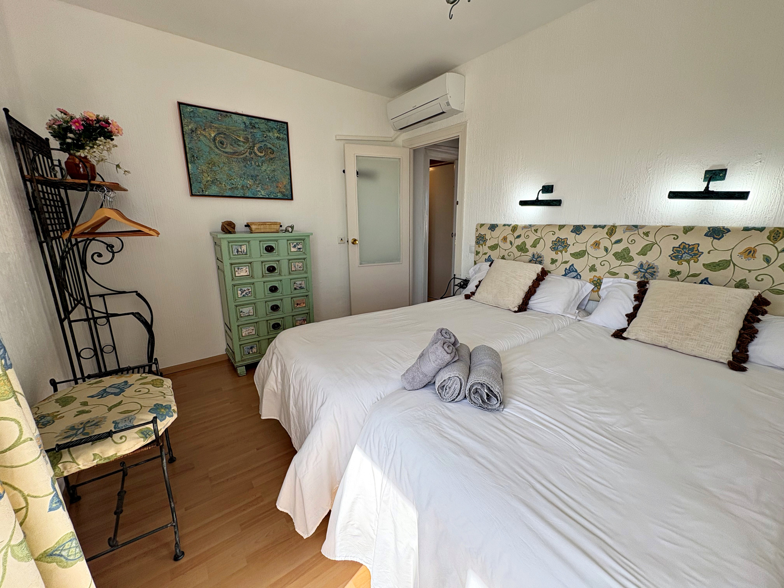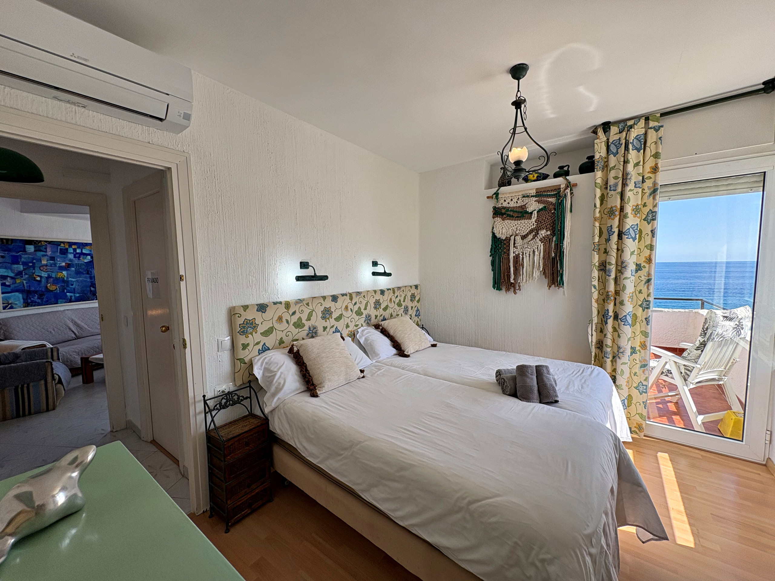 Tiene dos habitaciones, ambos con dos camas individuales, aire acondicionado y vistas al mar. Desde una de las habitaciones se puede acceder también a la terraza mencionada anteriormente.