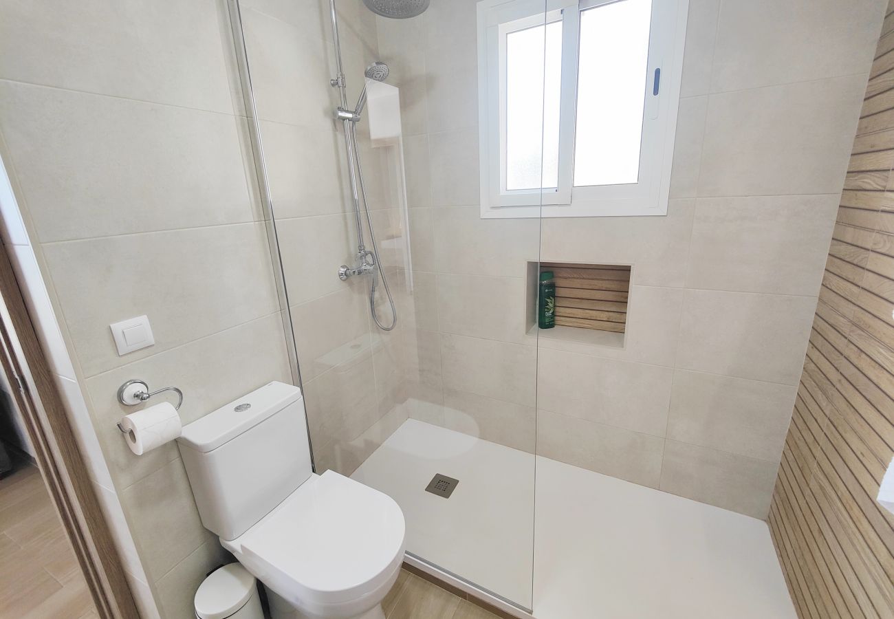 Además, hay 1 baño moderno con plato de ducha y 2 amplios dormitorios. El amplio dormitorio principal tiene cama king size, gran armario empotrado, zona de estar, aire acondicionado y acceso directo a la zona exterior. El segundo dormitorio tiene dos camas individuales, armario empotrado y aire acondicionado frío/calor.