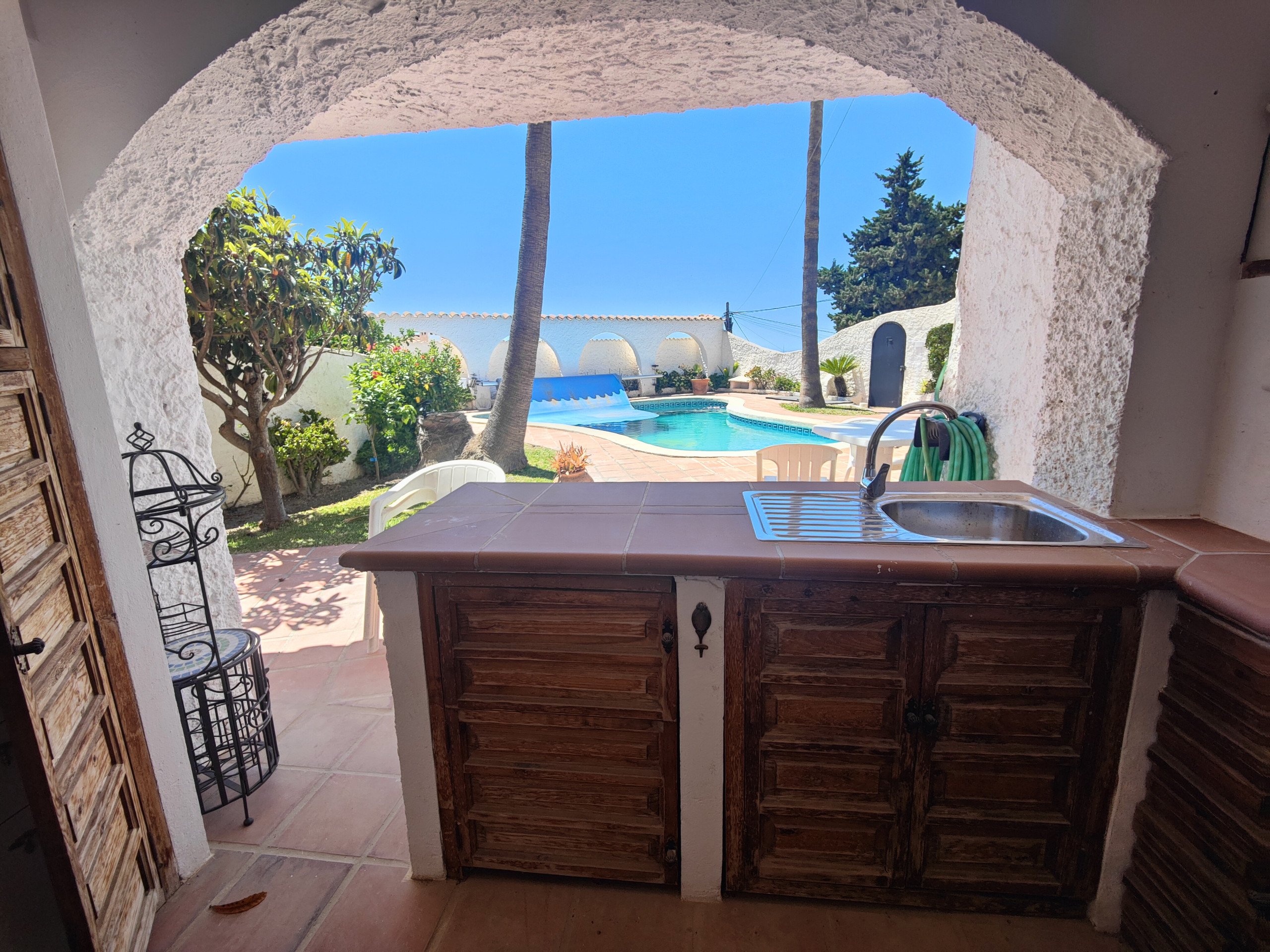 La zona exterior está compuesta por diferentes espacios y áreas, la primera área que encontramos es la encantadora piscina privada y una pequeña cocina exterior con frigorífico y fregadero. Desde allí se puede acceder a un jardín al lado de la casa. Al otro lado del área de la piscina está el acceso a un garaje privado y una sala de servicio donde se guarda la lavadora.