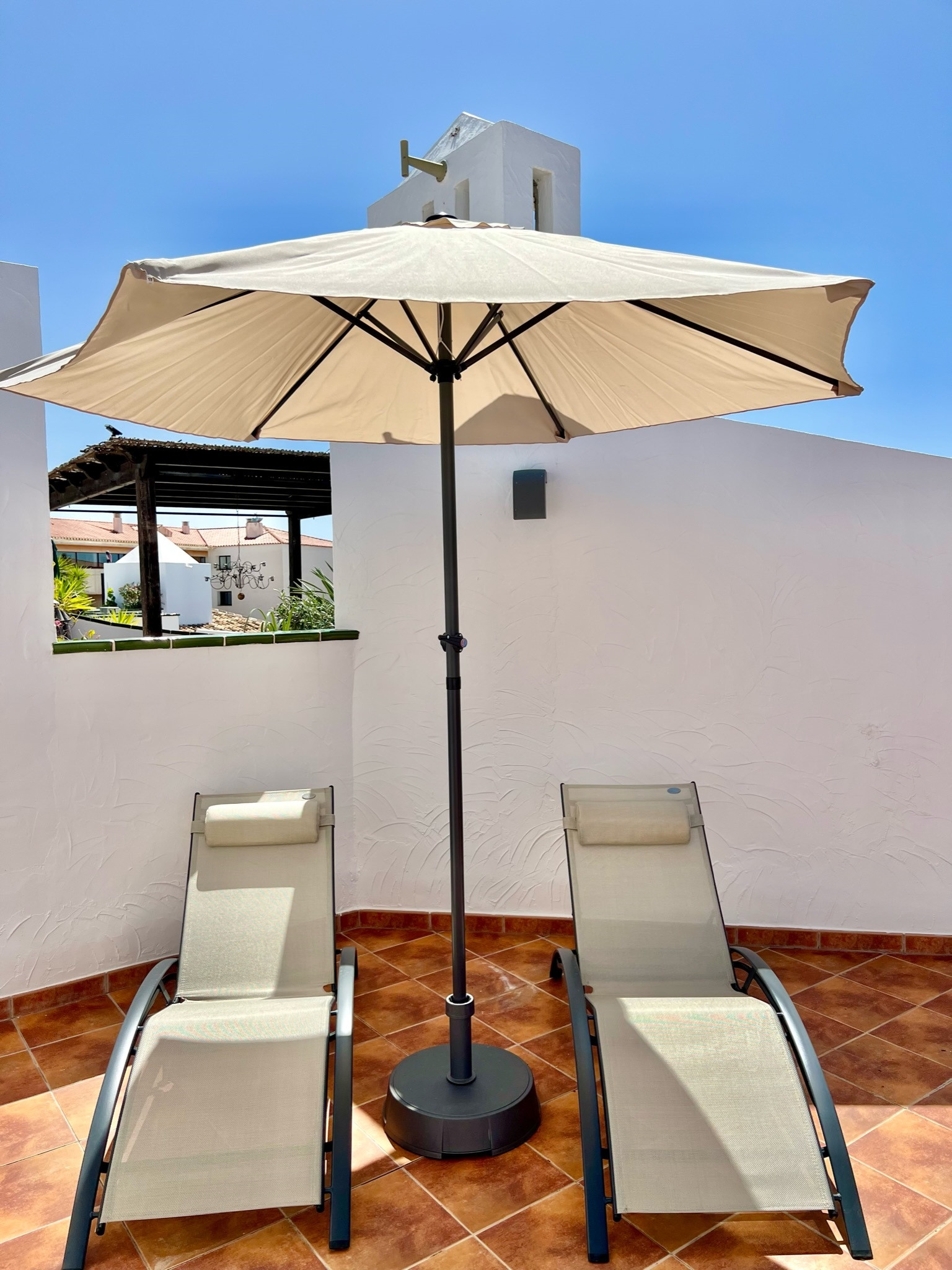 A spiral staircase takes you up to the stunning roof terrace with sun most of the day and sea views. Furnished with a dining table and chairs for eating al fresco, two sunbeds and an outdoor shower to cool off. Here is also a laundry cupboard with a washing machine and drying rack.