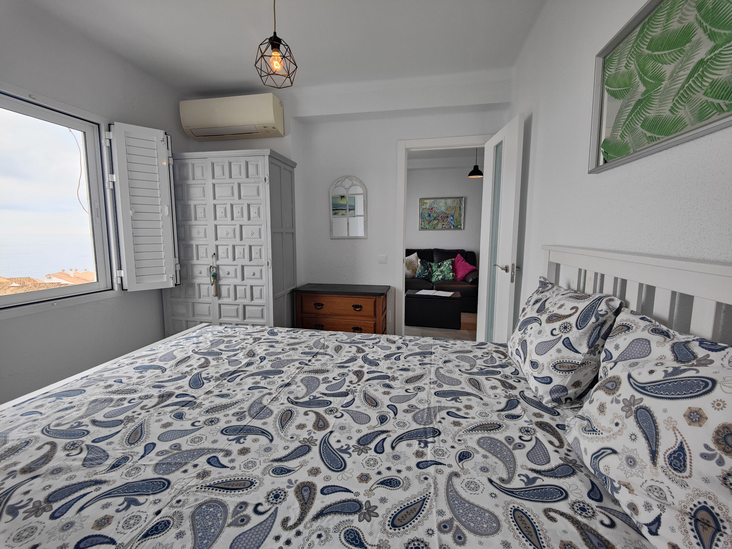 The master bedroom features a double bed and stunning sea views, while the second bedroom offers a single bed. All rooms, including the living room, are equipped with air conditioning for your comfort.