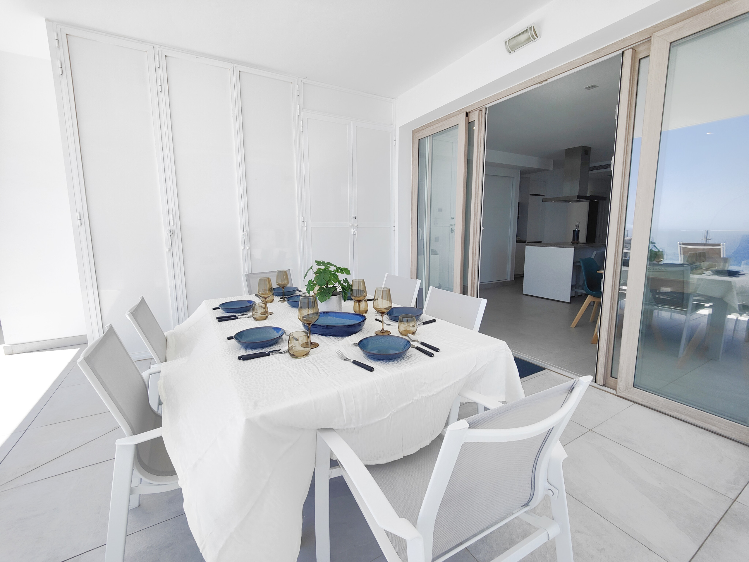 From the living room there is direct access via sliding windows to the incredible south-facing terrace that offers amazing up close sea views. It comprises of a chillout area as well as two sunbeds and a covered outdoor dining area. Also here is a large outdoor unit where the washing machine and drier is located.