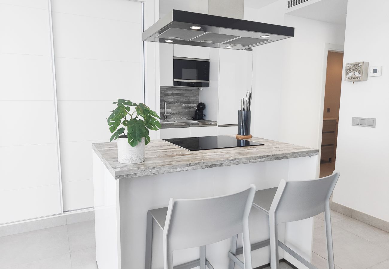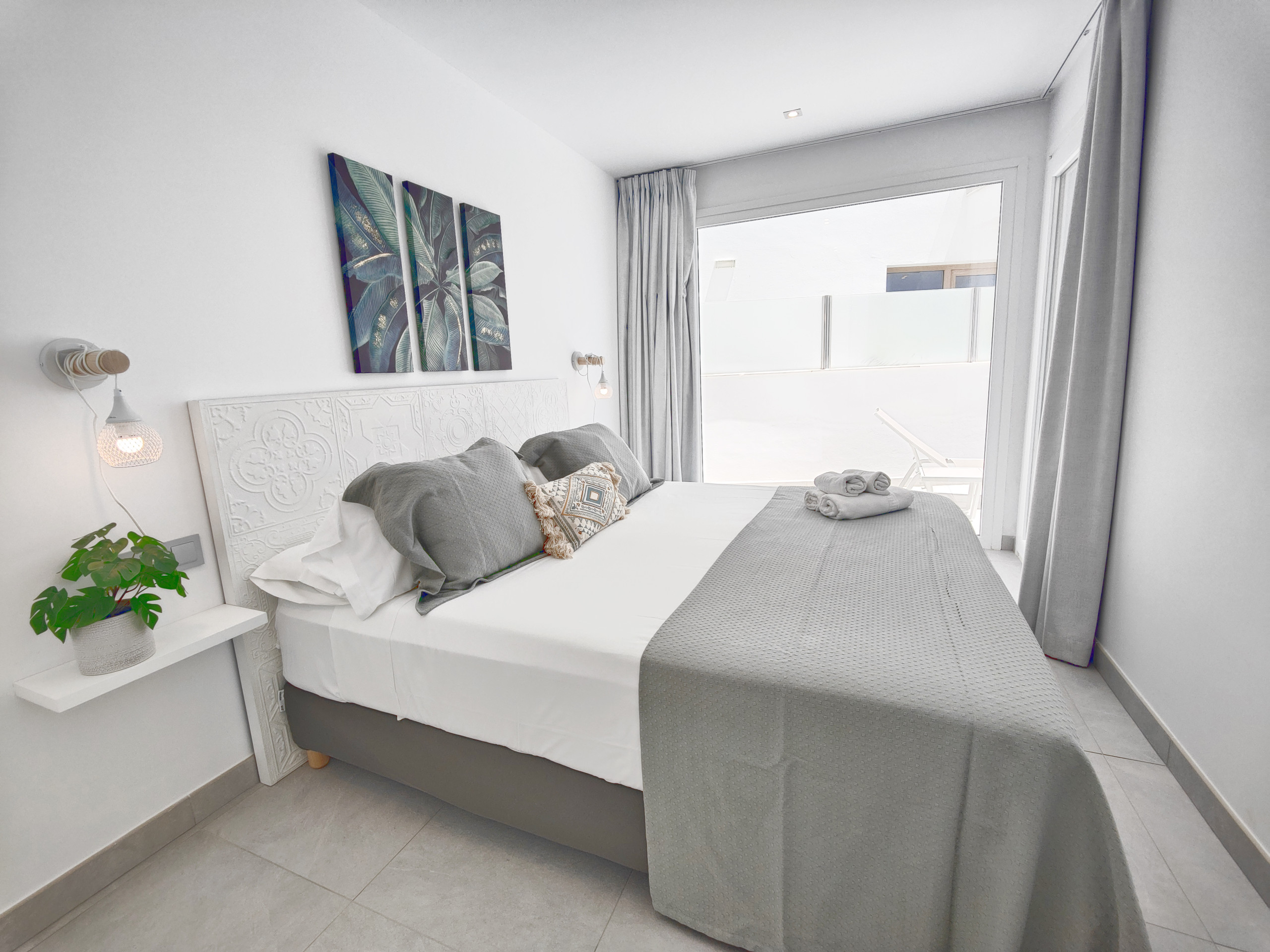 There are two bedrooms, the main bedroom is fitted with two single beds put together with one double mattress topper and has an en-suite double bathroom with walk-in shower. The second bedroom has two single beds. Both bedrooms have built-in wardrobes and direct access to an additional smaller terrace that connects to the main terrace.