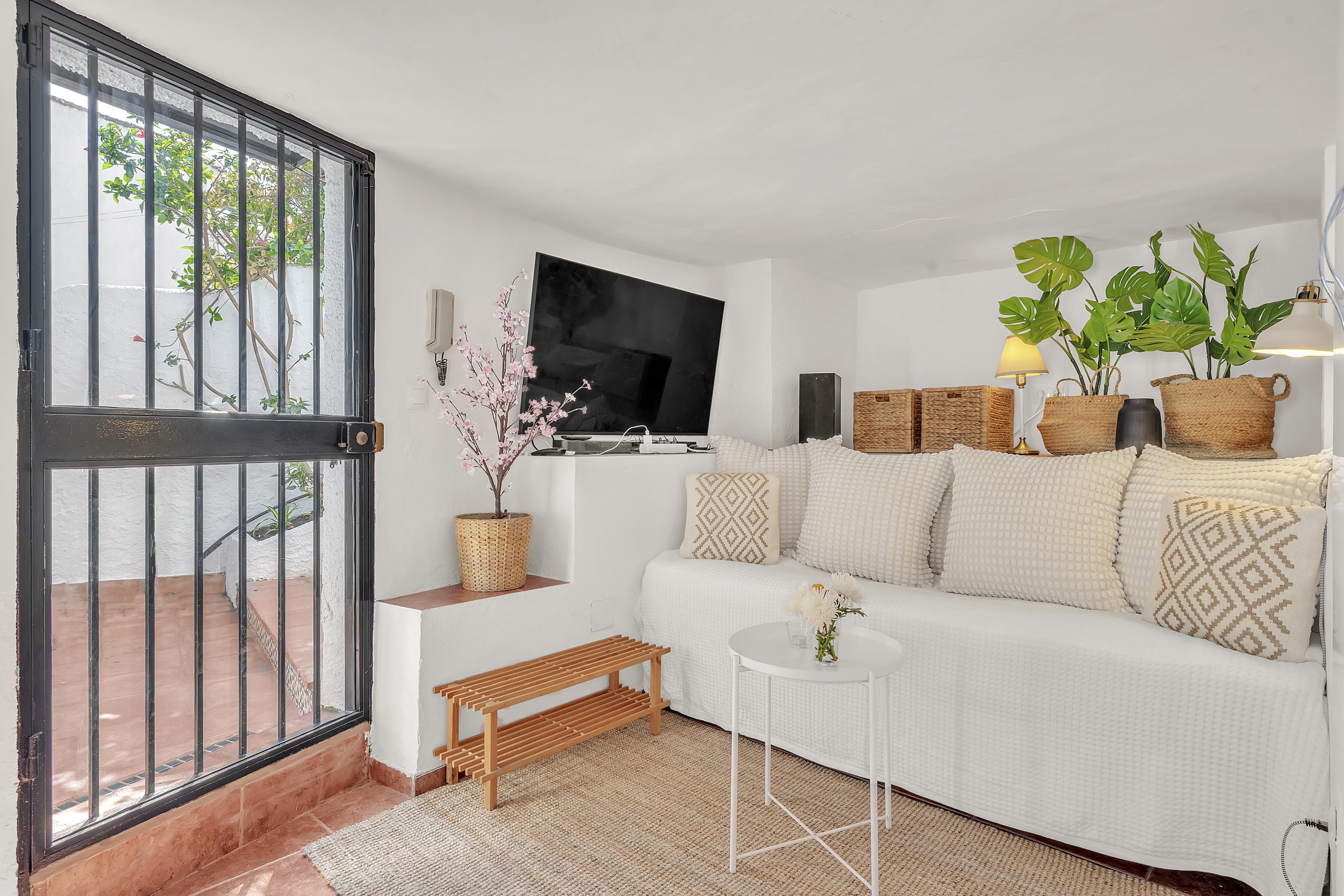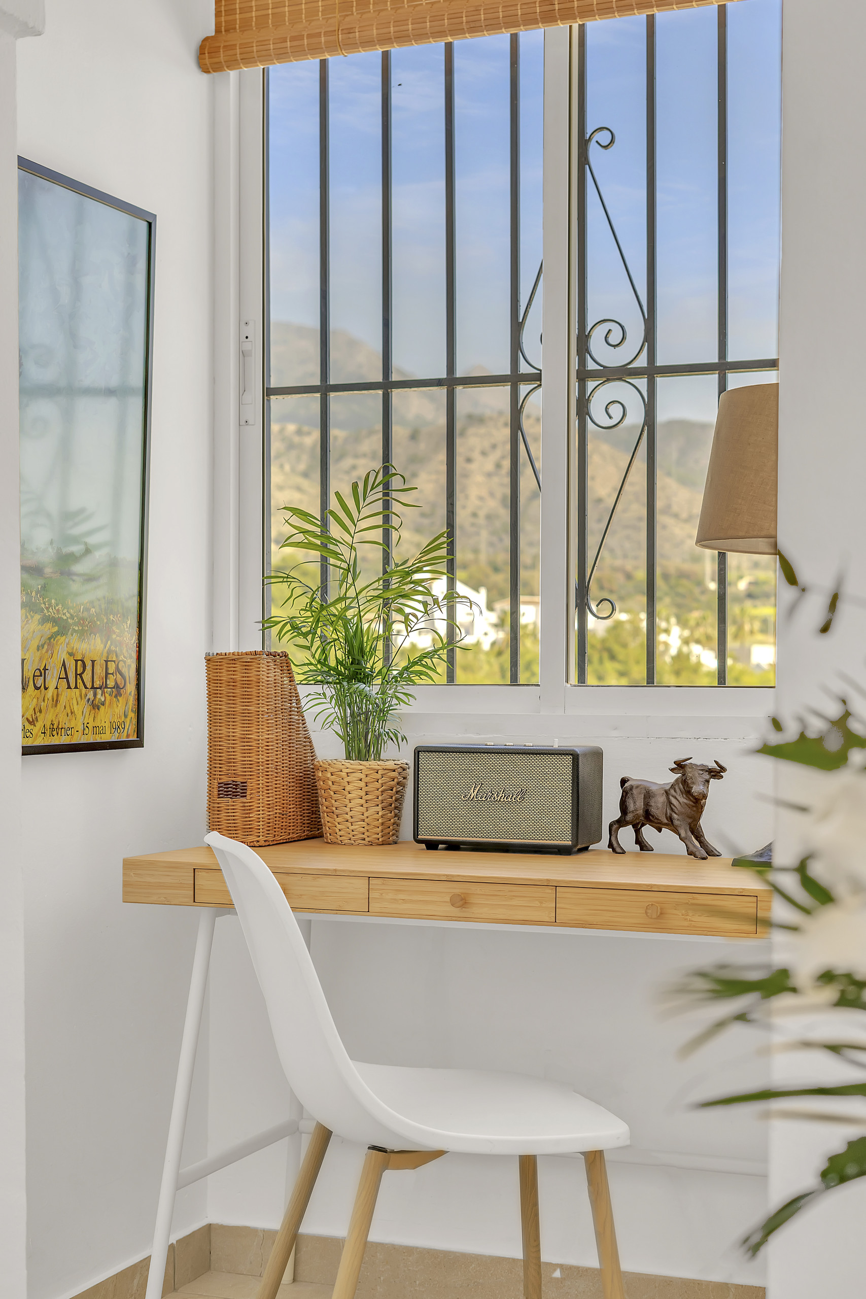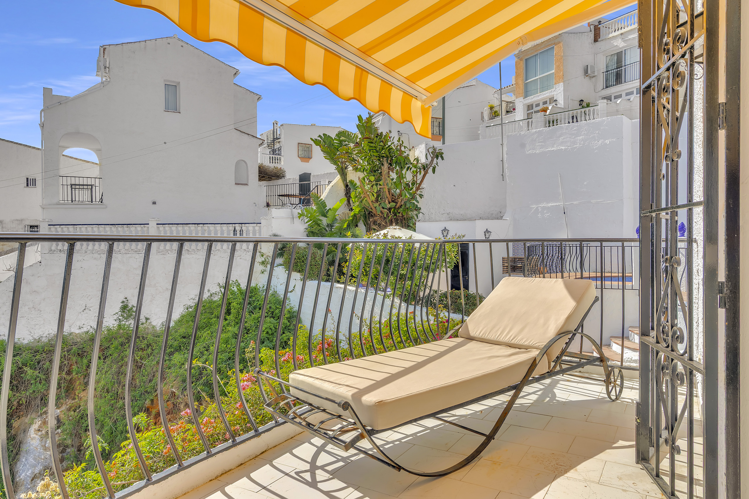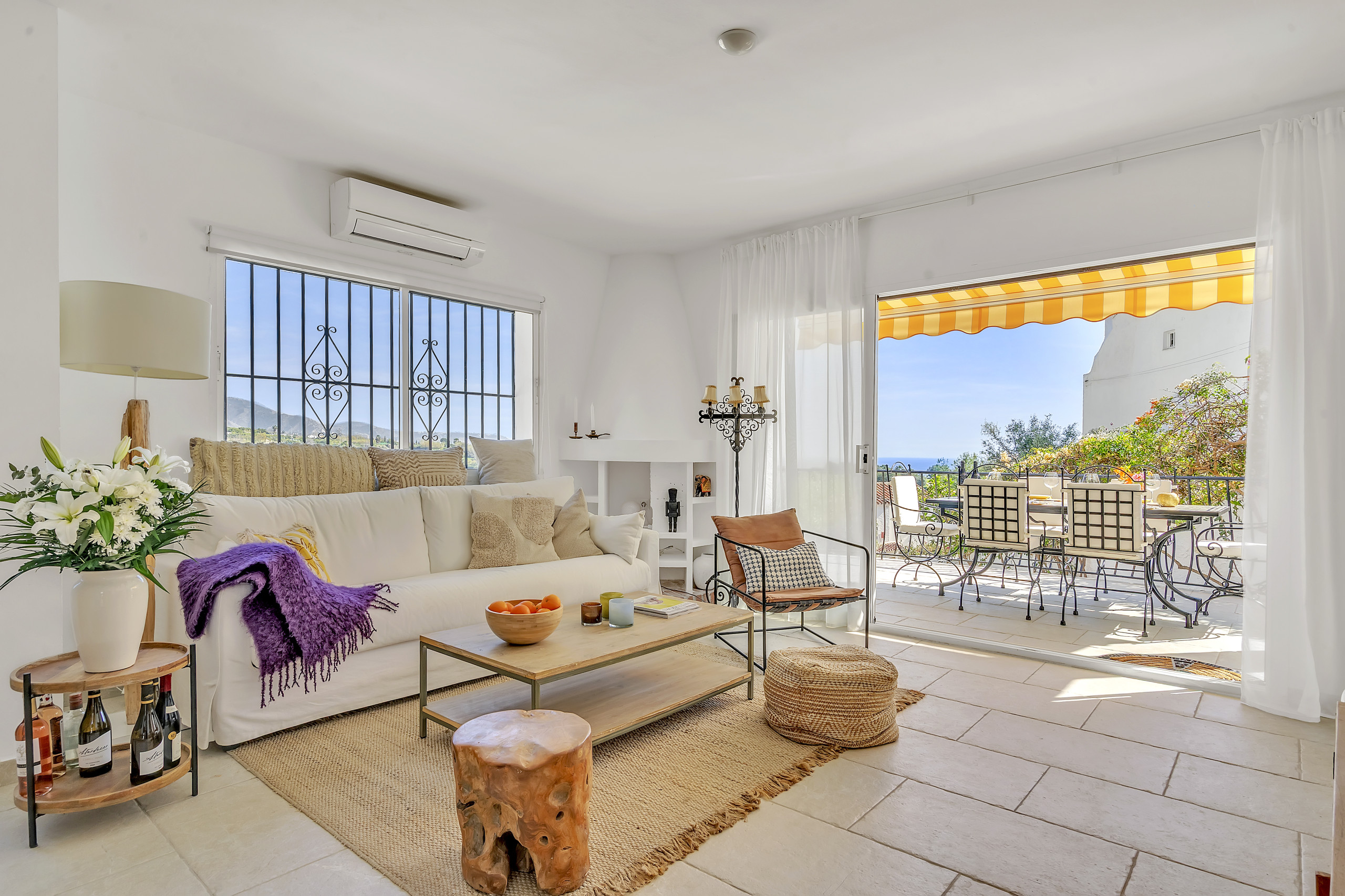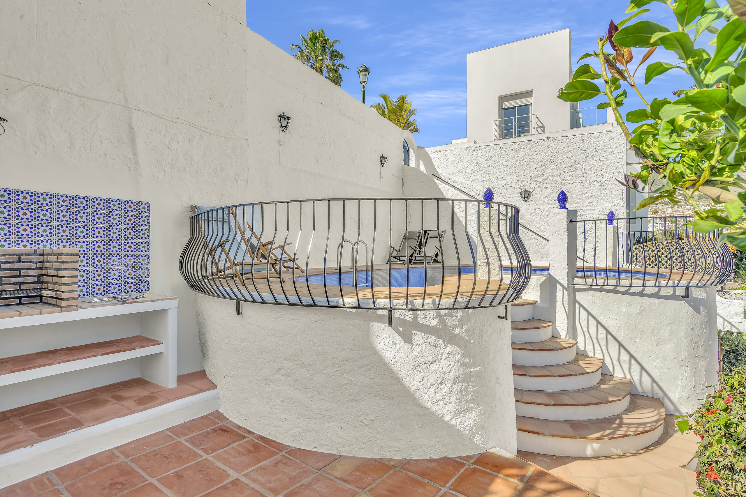 From the living room you can walk straight out into a small terrace and then walk down to the pool and pool area. The pool area offers seating áreas and sun beds. After the pool area you can choose to sit in the pergola/bbq area or the snug with fantastic views over the Punta Lara urbanización, ocean and Nerja to the left. If you want a bit more peace and quite there is an area by the fountain further down in the garden.